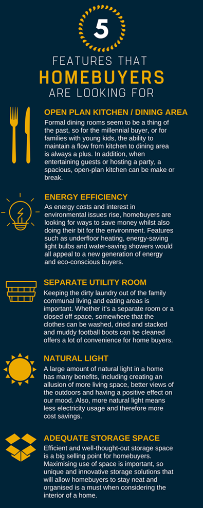 As energy costs and interest in environmental issues rise, homebuyers are looking for ways to save money whilst also doing their bit for the environment. Features such as underfloor heating, energy-saving lightbulbs and water-saving showers would all appeal to a new generation of energy and eco-conscious buyers.