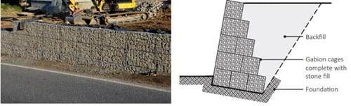 Gabion walls are large rectangular cages or baskets, made of hexagonal woven steel wire or square welded mesh, filled with stone. Gabions are used to build retaining walls, revetments, and anti-erosion works. Box gabions are normally available in half metre modules of length 2m to 6m, width 1m to 2m, and in depths of 0.3m, 0.5m, and 1m.