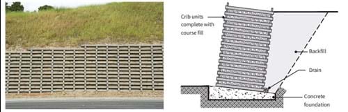 Crib walls are flexible, open-faced structures constructed from individual units, and either made of timber or precast concrete dependent