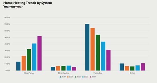 In the below chart, we can see the industry proactively reacting to industry changes with heat pump adoption seeing a continuous rise while mains gas saw a sharp drop-off in 2024.