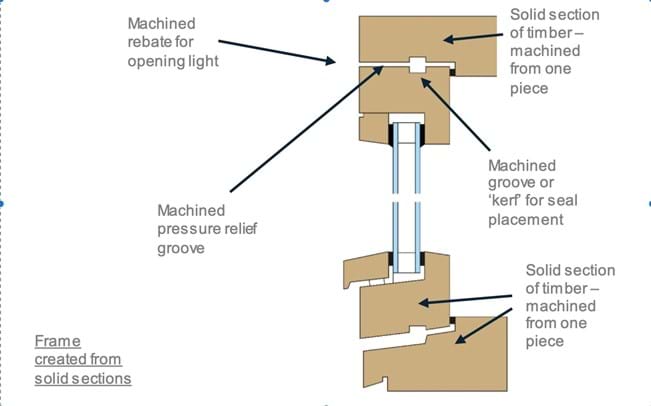 ‘Machined’ timber frame sections are traditionally produced from solid sections of timber. A square section of timber is taken, and portions removed to give it a functional shape or ‘profile’. The removal of an area of timber from the the solid section is known as creating a ‘rebate’ and this then can receive glazing or opposing rebates are used to facilitate opening portions of the window, arranged and aligned to provide weather protection when the opening light is closed.
