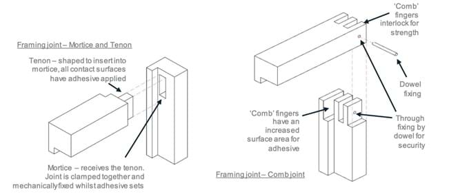 It is largely recognised that their strength is not only their intersecting nature, but that they also provide a large surface area for the application of adhesive and also have the joint secured with non-ferrous screws, nails or star dowels whilst glue sets.
