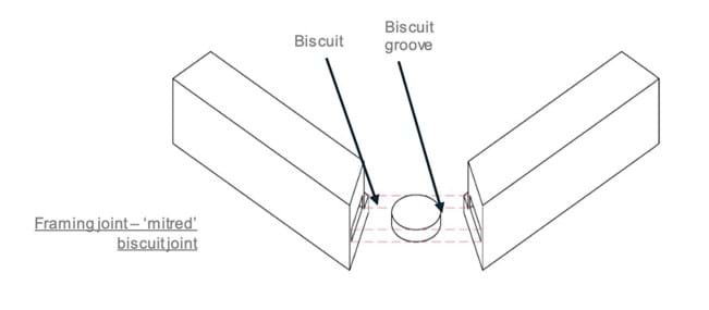 A ‘biscuit’ (biscuits are pieces of pre-made oval shaped timber) and adhesive completes the joint. The biscuit increases the surface area for adhesive, and creates an intersecting part to the joint.