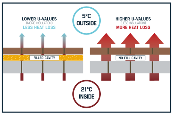 U-values are measured in watts per square metre per degree Kelvin. So for a brick and block cavity wall with a U-value of 0.3 W/m2K, would mean that for every 1 ⁰C degree difference between inside and outside the wall, 0.3 watts will be transferred every square metre.